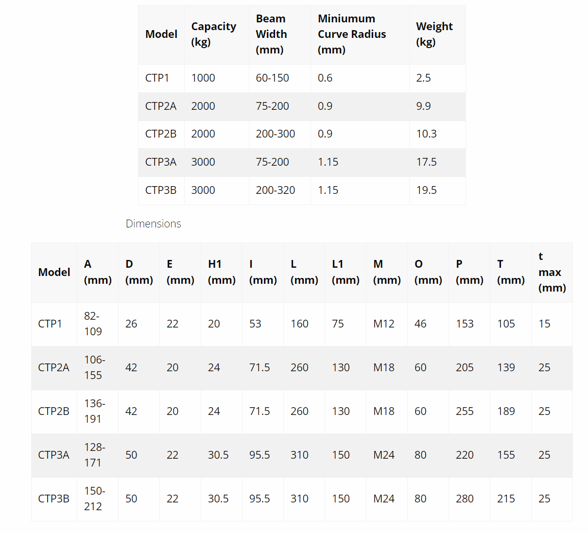 The easy installation to any beam makes the CTP suitable for fixing to any hoists, pulleys and loads you wish to move. It can be adjusted quickly to the beam width by turning the main spindle and safety is ensured by the special locking lever. The spindle and snap pin stops are galvanised to protect against corrosion.